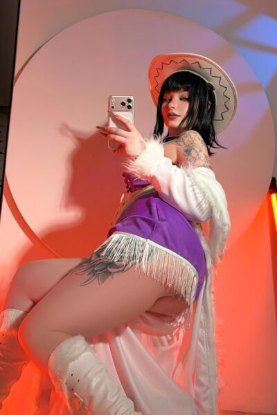 Cosplay girl with a big toy in public