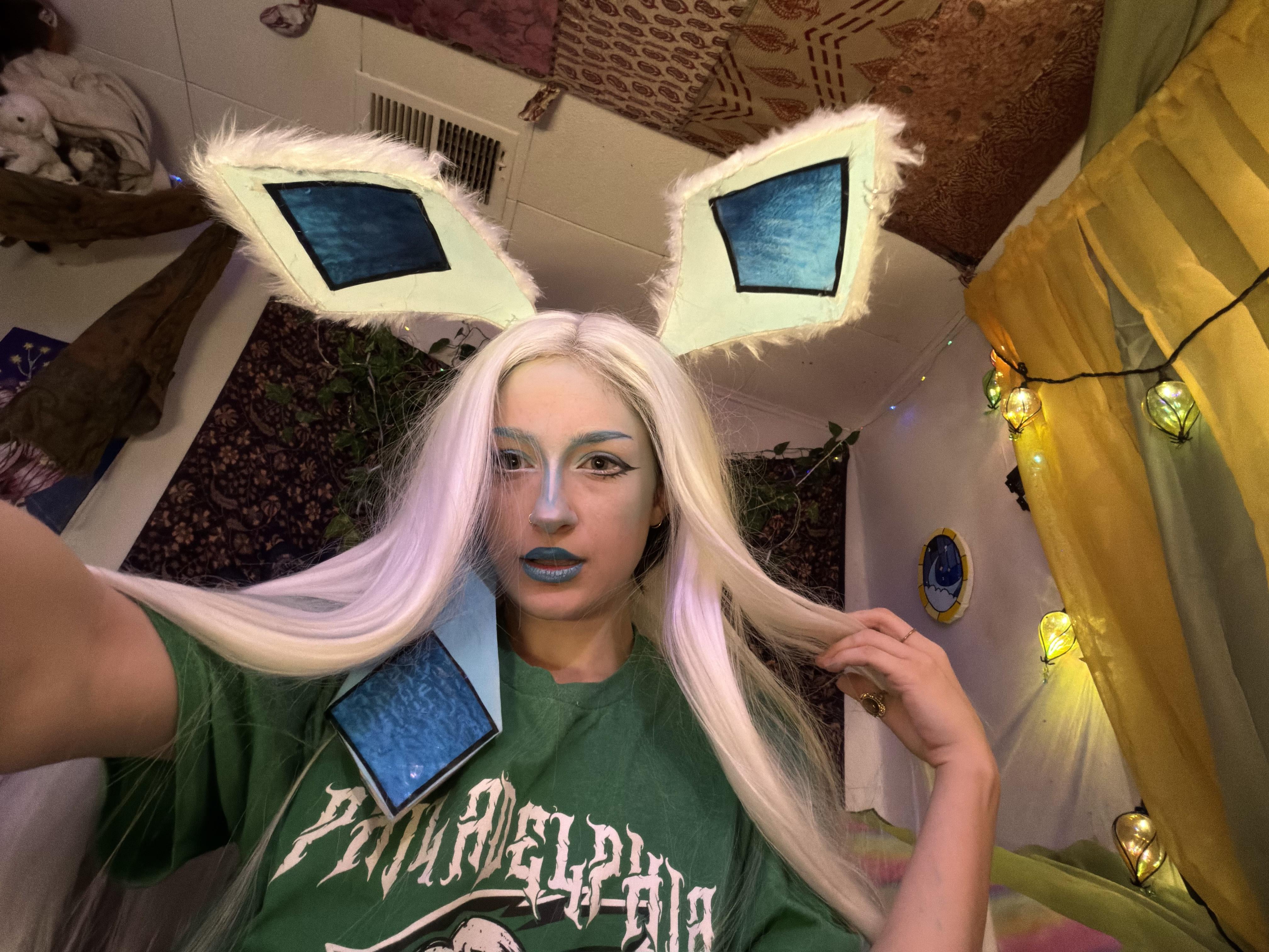 Hi!! I’m new to cosplay and did a glaceon cosplay from what’s in my craft bin! Ignore the eagles shirt we were focusing on the makeup xoxo