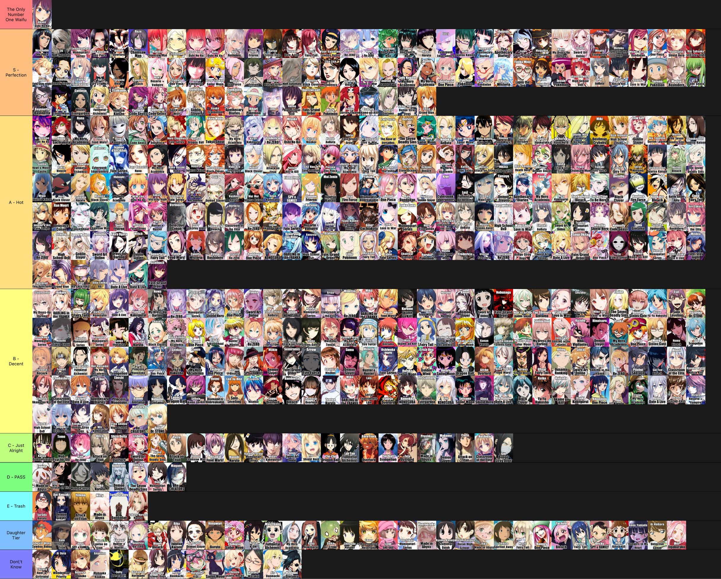 My personal anime waifu tier list (updated). Sorry for the absence of Speedwagon and Zoro, but I didn’t find them