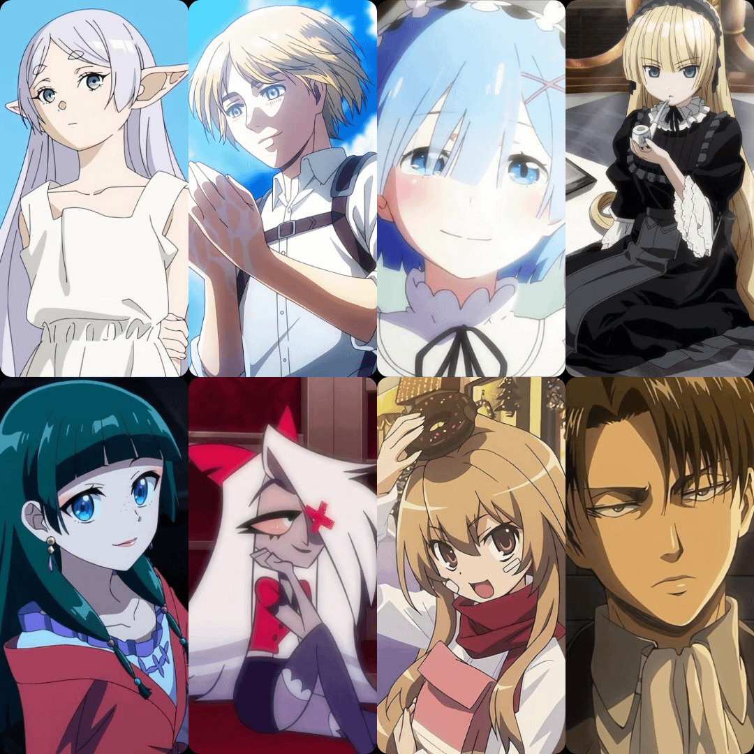What do my waifus and husbandos say about me? Listed below: Frieren, Armin Arlet, Rem, Victorique de Blois, Maomao, Vaggie, Taiga Aisaka, and Levi Ackerman.
